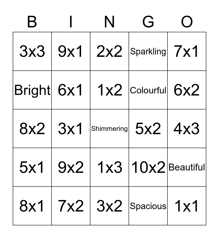 This bingo card has 33 words: 1x1, 2x1, 3x1, 4x1, 5x1, 6x1, 7x1, 8x1, 9x1, 10x1, 1x2, 2x2, Bingo ICT-idee, 4x2, 5x2, 6x2, 7x2, 8x2, 9x2, 10x2, 1x3, 2x3, 3x3, 4x3, 3x2, Shimmering, Sparkling, Colourful, Bright, Beautiful, Glowing, Spacious and Adjective.