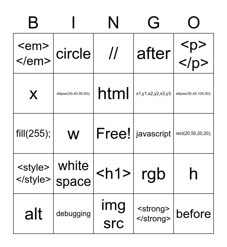 This bingo card has a free space and 34 words: </h2>, <strong></strong>, fill(0);, "", <style></style>, ellipse(30,40,50,50);, <p></p>, alt, circle, set the background color, html, //, ;, <br>, javascript, ellipse(30,40,100,50);, debugging, fill(255);, white space, rgb, <h1>, background(0);, <em></em>, rect(20,50,20,20);, img src, before, after, yellow, x1,y1,x2,y2,x3,y3, x, y, w, h and x,y,w,h.