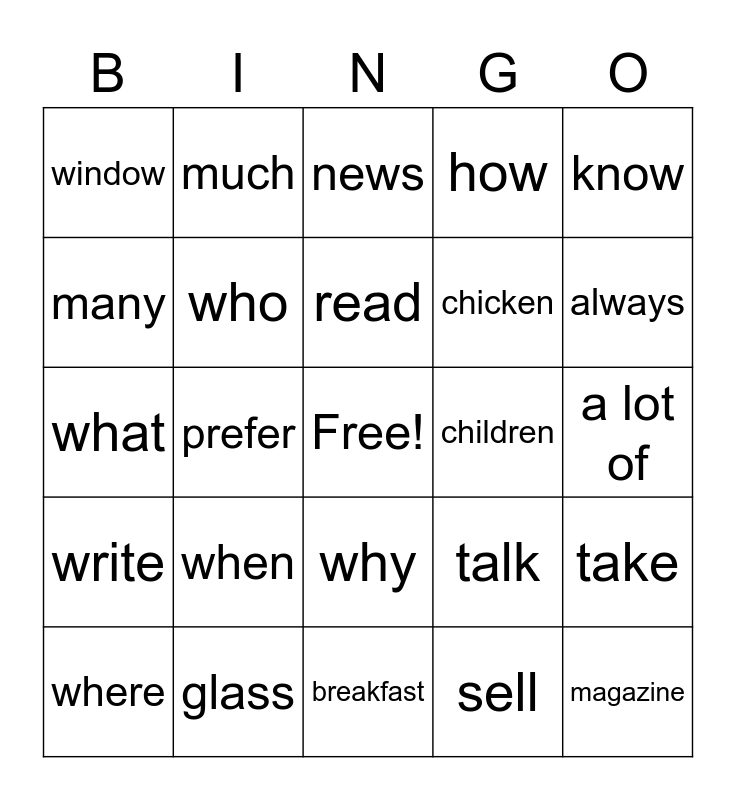 This bingo card has a free space and 39 words: how much, how many, speak, talk, take, write, prefer, bottle, children, a lot of, many, much, some, always, what, when, why, how, because, where, who, read, sell, know, sugar, glass, breakfast, dinner, lunch, window, door, newspaper, chicken, magazine, city, meat, news, class and English.