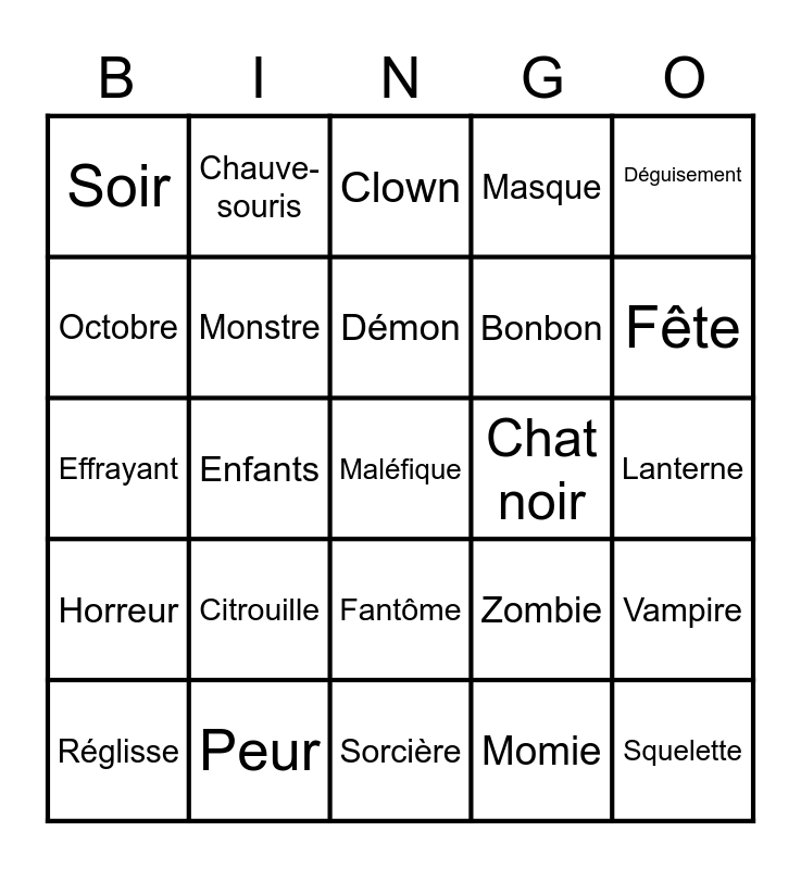 This bingo card has a free space and 24 words: Citrouille, Peur, Démon, Réglisse, Déguisement, Soir, Octobre, Chauve-souris, Chat noir, Fantôme, Bonbon, Effrayant, Zombie, Vampire, Monstre, Momie, Lanterne, Clown, Fête, Enfants, Squelette, Horreur, Masque and Sorcière.