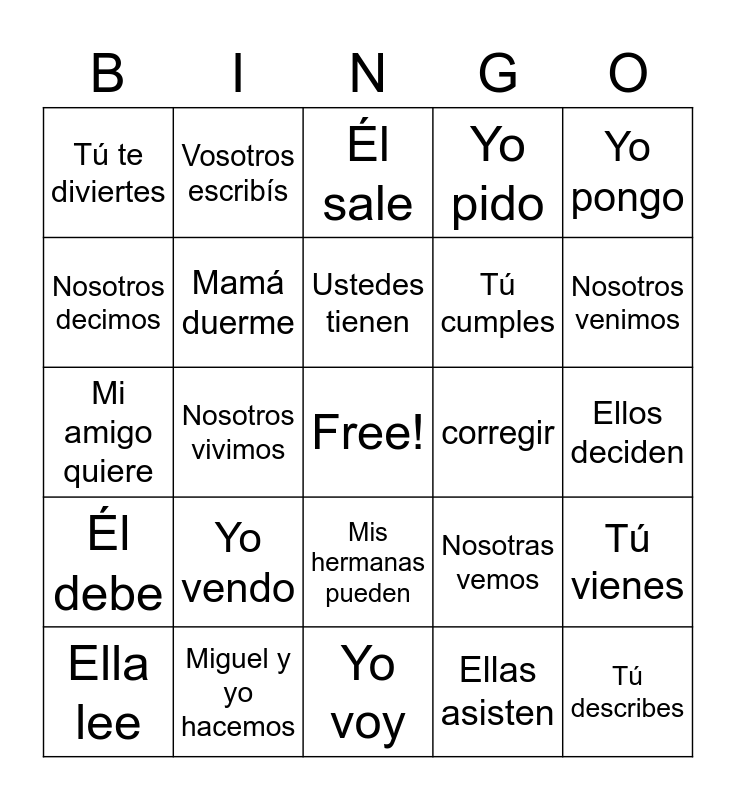 This bingo card has a free space and 29 words: Ella lee, Yo comparto, Nosotros vivimos, Ustedes comen, Tú te diviertes, Él sale, Mamá duerme, Yo vendo, corregir, Miguel y yo hacemos, Ellos deciden, Tú describes, Yo voy, Ellas asisten, Nosotros venimos, compartir, Mis hermanas pueden, Él debe, Yo pongo, Mi amigo quiere, Nosotras vemos, Tú sabes, Tú cumples, Nosotros decimos, Yo pido, Vosotros escribís, Tú vienes, Ustedes tienen and Él aprende.
