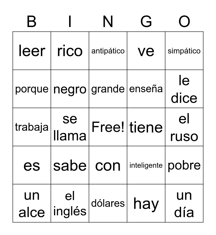 This bingo card has a free space and 32 words: hay, una piña, se llama, tiene cinco años, es, negro, simpático, pobre, rico, estúpido, grande, antipático, vive, le gusta, tiene, el español, un alce, trabaja, con, sabe, inteligente, habla, el ruso, el inglés, un día, ve, enseña, porque, leer, dólares, feliz and le dice.