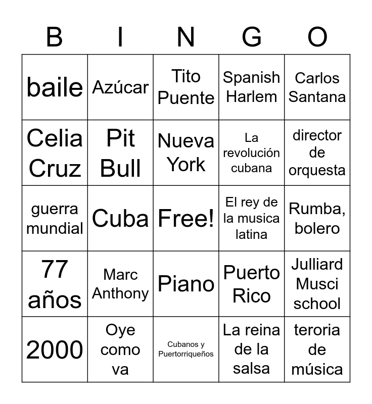This bingo card has a free space and 24 words: Marc Anthony, Oye como va, Nueva York, 2000, Carlos Santana, baile, Celia Cruz, Azúcar, El rey de la musica latina, Piano, La revolución cubana, guerra mundial, Puerto Rico, Julliard Musci school, Pit Bull, La reina de la salsa, Rumba, bolero, Tito Puente, director de orquesta, Cuba, teroria de música, 77 años, Spanish Harlem and Cubanos y Puertorriqueños.