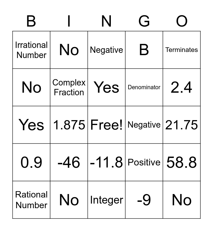 This bingo card has a free space and 55 words: Absolute Value, Rational Number, Terminating Decimal, Irrational Number, Integer, Additive Inverse, Complex Fraction, Numerator, Denominator, Reciprocals, B, 2, 18, No, 85, Repeats, Terminates, 1.875, 0.1111…, No, Negative, Positive, Positive, Negative, -1, Yes, -9, $18, 21.75, 58.8, Positive, Negative, Negative, Negative, No, Yes, -8/3 or -2 ⅔, 0.9, -$7.20, -9,450, No, Yes, Yes, No, -46, No, Jeremiah, $7, -8/9, 2.4, 2.8, -15, $145.78, -11.8 and -8.6.