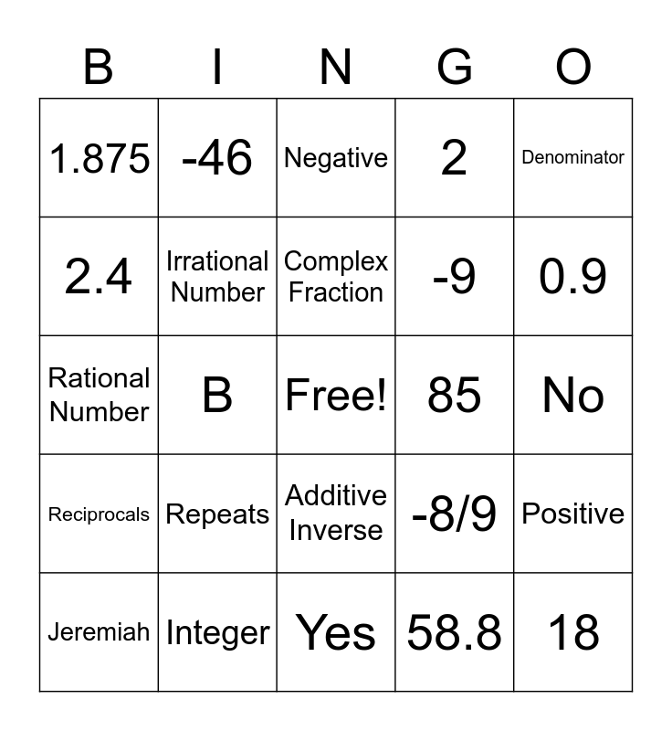 This bingo card has a free space and 41 words: Absolute Value, Rational Number, Terminating Decimal, Irrational Number, Integer, Additive Inverse, Complex Fraction, Numerator, Denominator, Reciprocals, B, 2, 18, No, 85, Repeats, Terminates, 1.875, 0.1111…, Negative, Positive, -1, Yes, -9, $18, 21.75, 58.8, -8/3 or -2 ⅔, 0.9, -$7.20, -9,450, -46, Jeremiah, $7, -8/9, 2.4, 2.8, -15, $145.78, -11.8 and -8.6.