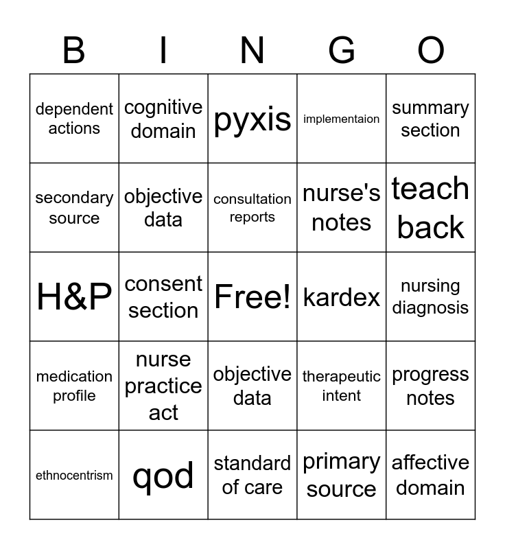 This bingo card has a free space and 24 words: nurse practice act, qod, consultation reports, ethnocentrism, summary section, dependent actions, secondary source, cognitive domain, kardex, objective data, nurse's notes, H&P, therapeutic intent, progress notes, objective data, primary source, nursing diagnosis, pyxis, teach back, consent section, affective domain, medication profile, implementaion and standard of care.