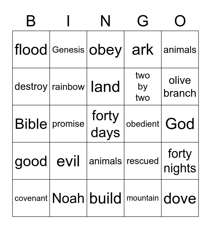This bingo card has 28 words: forty nights, rain, two by two, mountain, destroy, obey, Genesis, good, obedient, covenant, Bible, ark, Noah, build, olive branch, raven, evil, rainbow, land, animals, flood, dove, forty days, promise, God, rescued, animals and water.