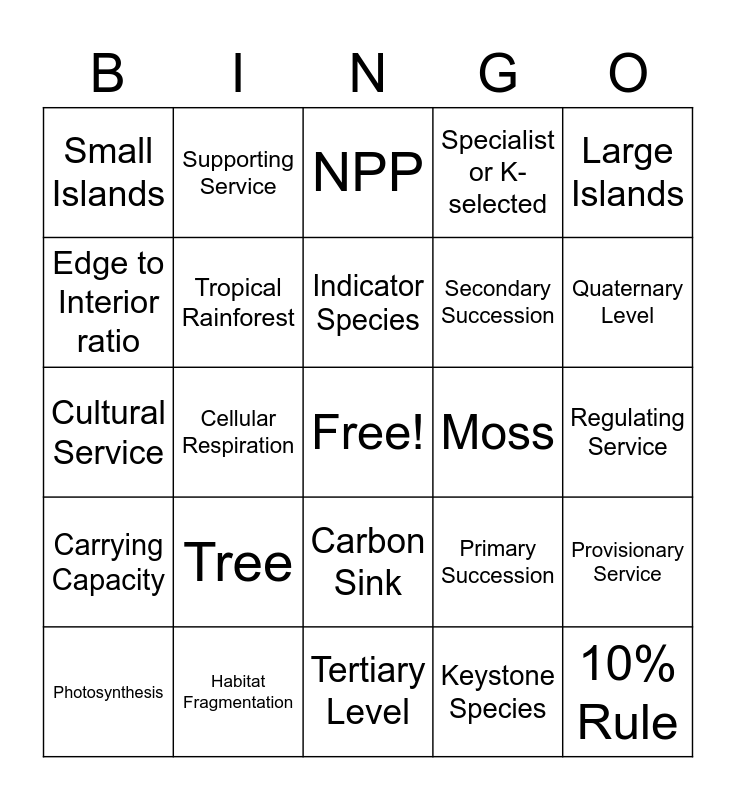 This bingo card has a free space and 26 words: Carbon Sink, Keystone Species, Indicator Species, Habitat Fragmentation, Large Islands, Small Islands, Edge to Interior ratio, Supporting Service, Regulating Service, Primary Succession, Secondary Succession, Cultural Service, Provisionary Service, Photosynthesis, Cellular Respiration, Generalist or r-Selected, Specialist or K-selected, Carrying Capacity, NPP, 10% Rule, Quaternary Level, Tertiary Level, Moss, Tree, Tropical Rainforest and Tundra.