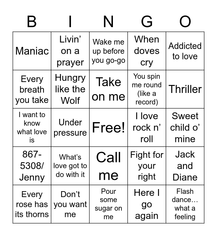 This bingo card has a free space and 58 words: Sweet dreams (are made of this), Don’t you want me, Push it, 867-5308/ Jenny, Here I go again, Who can it be now?, Hungry like the Wolf, Total eclipse of the heart, You spin me round (like a record), Like a Prayer, When doves cry, Girls just want to have fun, Beat it, In the air tonight, Maneater, Maniac, Flash dance…what a feeling, Addicted to love, It’s still rock and roll to me, Take on me, I love rock n’ roll, Wake me up before you go-go, Every rose has its thorns, Jack and Diane, Hey Mickey, Sweet child o’ mine, I wanna dance with somebody (who loves me), Straight up, Thriller, Tainted Love, Love shack, Kids in america, Come on Eileen, Jessie’s girl, Faith, Crazy little thing called love, Billie Jean, Under pressure, I want to know what love is, Another one bites the dust, What’s love got to do with it, Time after Time, Fight for your right, Karma Chameleon, Jump, Word up, Careless memories, Call me, Pour some sugar on me, Don’t you (forget about me), Should I stay or should I go, Physical, (I just) died in your arms, Hurts so good, Livin’ on a prayer, Eye of the tiger, Every breath you take and Love is a battlefield.