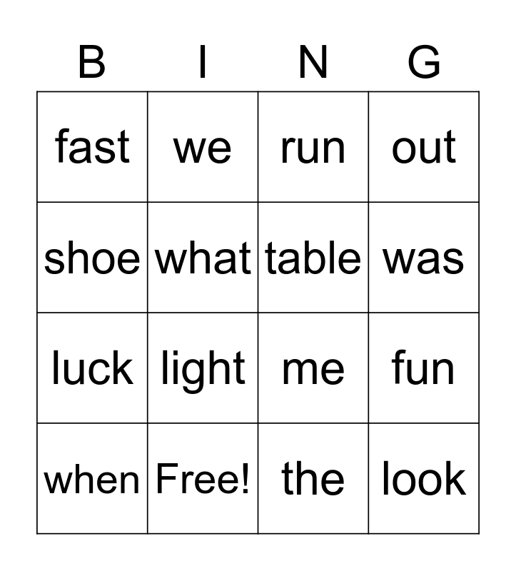 This bingo card has 16 words: Free!, fun, run, fast, luck, we, me, the, shoe, what, when, out, light, was, table and look.