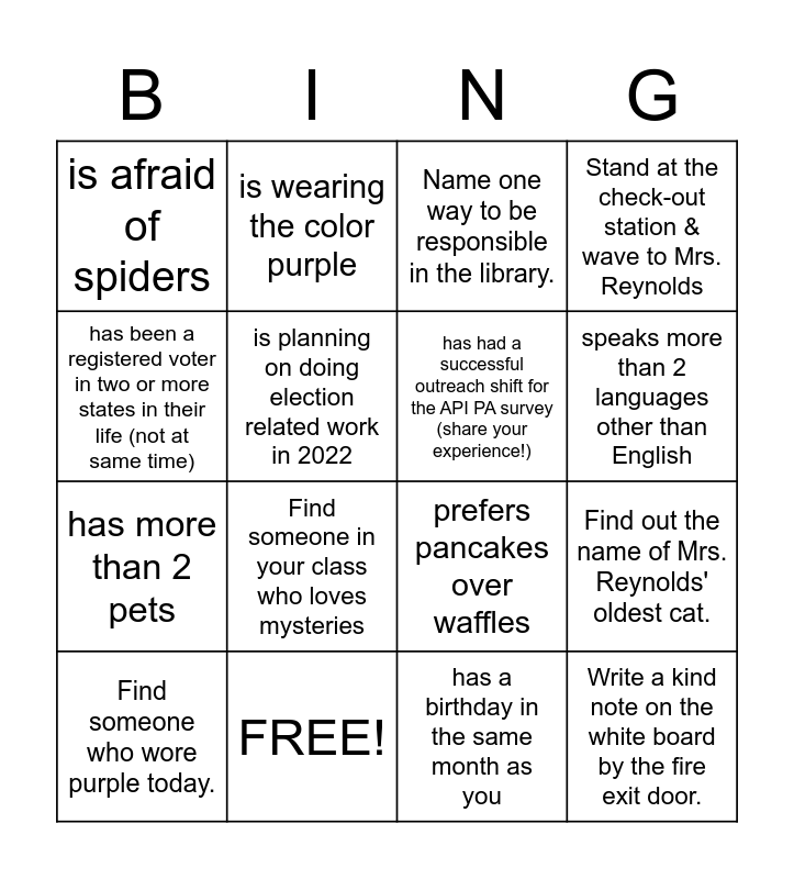 This bingo card has 25 words: has had stitches, has completed the full API PA survey themselves, speaks more than 2 languages other than English, has a birthday in the same month as you, has been a registered voter in two or more states in their life (not at same time), is afraid of spiders, is planning on doing election related work in 2022, is wearing the color purple, FREE!, doesn't like the beach, has more than 2 pets, prefers pancakes over waffles, likes candycorn, woke up before 6am today, has had a successful outreach shift for the API PA survey (share your experience!), has ran a marathon, has a birthday in the same month as you, Name one way to be responsible in the library., Find someone in your class who loves mysteries, Find out the name of Mrs. Reynolds' oldest cat., Find someone who wore purple today., How many shelves contain biogra- phy books?, Write a kind note on the white board by the fire exit door., Stand at the check-out station & wave to Mrs. Reynolds and What is the Dewey # for Fairy Tales?.