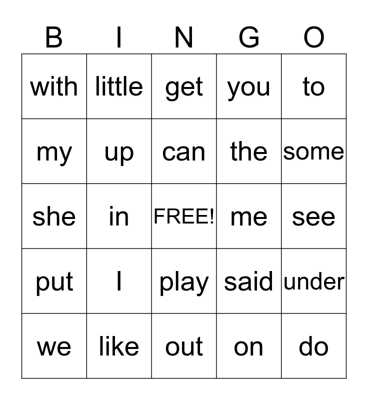 This bingo card has a free space and 24 words: I, like, can, we, to, with, my, little, me, play, the, she, said, under, up, on, see, get, some, in, do, put, you and out.