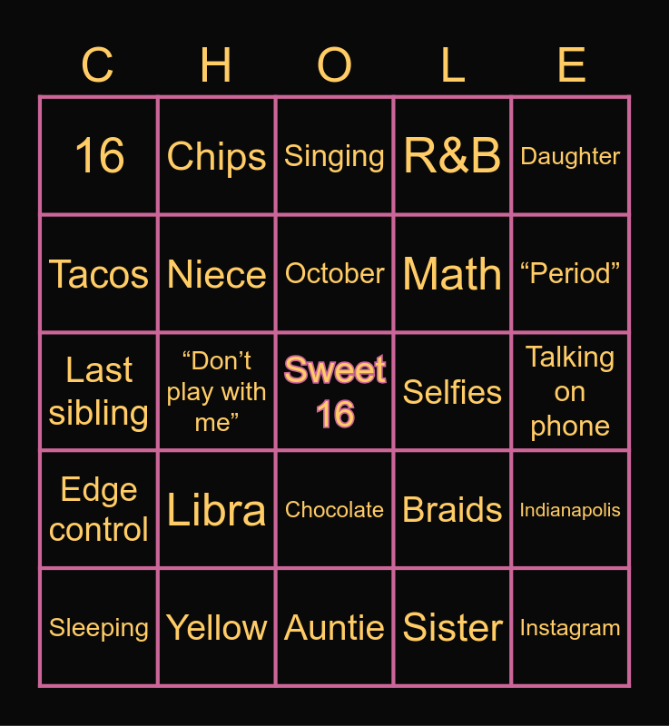 This bingo card has a free space and 24 words: Libra, Yellow, October, Sleeping, Daughter, 16, Tacos, Chips, Selfies, Chocolate, Math, Last sibling, Braids, Indianapolis, Niece, Sister, Talking on phone, Singing, “Period”, “Don’t play with me”, Instagram, Edge control, R&B and Auntie.