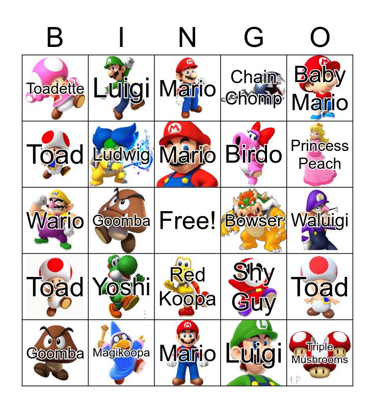 This bingo card has 24 images, a free space and 24 words: Yoshi, Magikoopa, Mario, Goomba, Baby Mario, Toadette, Toad, Luigi, Bowser, Red Koopa, Birdo, Wario, Shy Guy, Toad, Ludwig, Luigi, Waluigi, Mario, Princess Peach, Goomba, Triple Mushrooms, Toad, Chain Chomp and Mario.