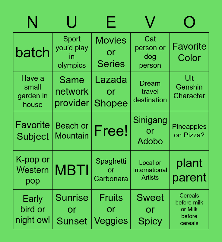 This bingo card has a free space and 30 words: Sunrise or Sunset, Sun or Moon, Beach or Mountain, Swim or Hike, batch, Movies or Series, Same network provider, Spaghetti or Carbonara, Sinigang or Adobo, Fruits or Veggies, Pineapples on Pizza?, Cereals before milk or Milk before cereals, Sweet or Spicy, zodiac sign, Ult Genshin Character, Gamer?, Local or International Artists, K-pop or Western pop, MBTI, Favorite Color, Favorite Subject, Sciences or Humanities, Sport you’d play in olympics, Dream travel destination, Have a small garden in house, Cat person or dog person, plant parent, Early bird or night owl, Lazada or Shopee and Single or Taken.
