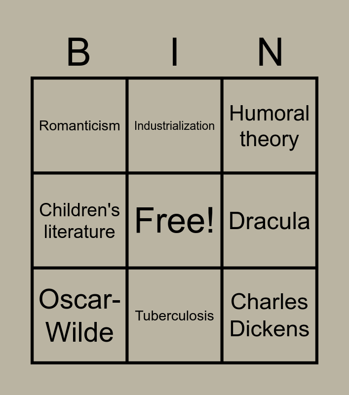 This bingo card has a free space and 11 words: Queen Victoria, Tuberculosis, Charles Dickens, Oscar-Wilde, Industrialization, Humoral theory, Dracula, 1837-1901, Children's literature, Romanticism and Novels.