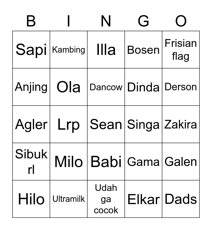 This bingo card has a free space and 24 words: Milo, Ultramilk, Dancow, Hilo, Frisian flag, Sapi, Anjing, Kambing, Singa, Babi, Dinda, Agler, Gama, Galen, Ola, Elkar, Zakira, Illa, Derson, Lrp, Dads, Sibuk rl, Bosen and Udah ga cocok.