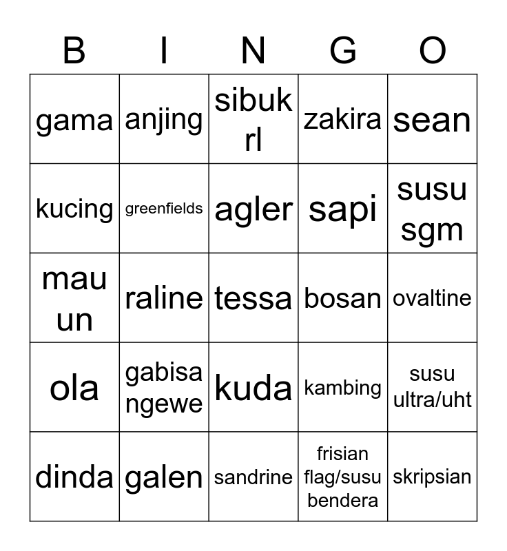 This bingo card has a free space and 24 words: gabisa ngewe, galen, agler, dinda, sean, gama, kucing, anjing, bosan, kuda, sapi, mau un, kambing, susu ultra/uht, greenfields, frisian flag/susu bendera, ovaltine, sibuk rl, susu sgm, raline, skripsian, ola, zakira and sandrine.