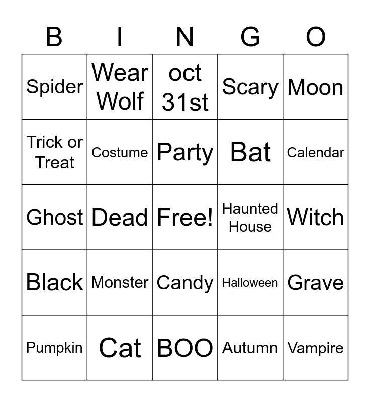 This bingo card has a free space and 24 words: Monster, Cat, Party, Pumpkin, Moon, Spider, Trick or Treat, Wear Wolf, Haunted House, Candy, Bat, Ghost, Halloween, Grave, Costume, Autumn, Witch, oct 31st, Calendar, Dead, Vampire, Black, Scary and BOO.
