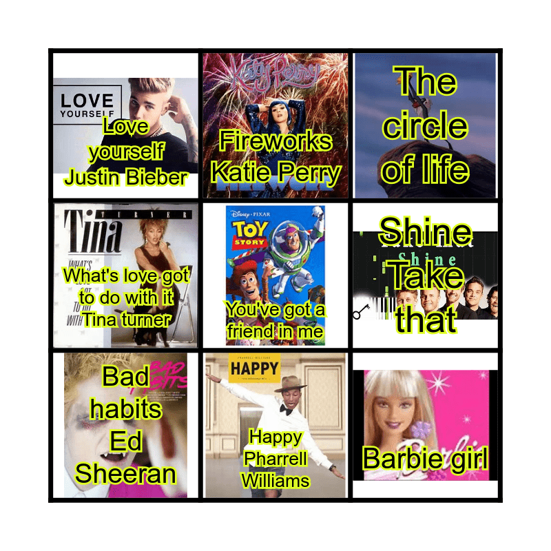 This bingo card has 11 images, a free space and 11 words: Wannabe Spice girls, Happy Pharrell Williams, Barbie girl, Bad habits Ed Sheeran, Fireworks Katie Perry, The circle of life, Shine Take that, Call me maybe Carly Rae Jepson, What's love got to do with it Tina turner, Love yourself Justin Bieber and Shout out to my Ex Little mix.