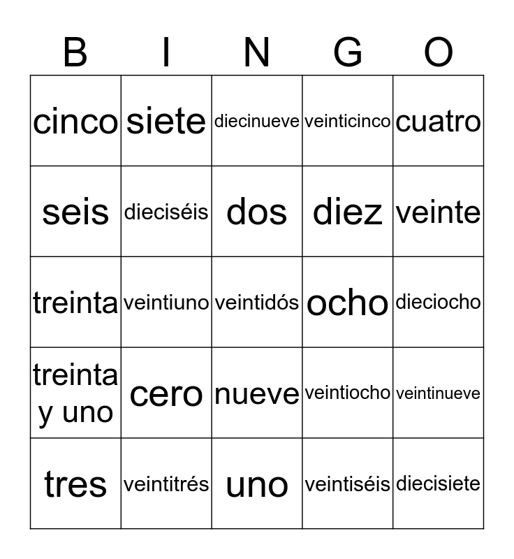 This bingo card has 25 words: cero, uno, dos, tres, cuatro, cinco, seis, siete, ocho, nueve, diez, treinta, veintiocho, veintinueve, dieciséis, diecisiete, dieciocho, diecinueve, veinte, veintiuno, veintidós, veintitrés, treinta y uno, veinticinco and veintiséis.
