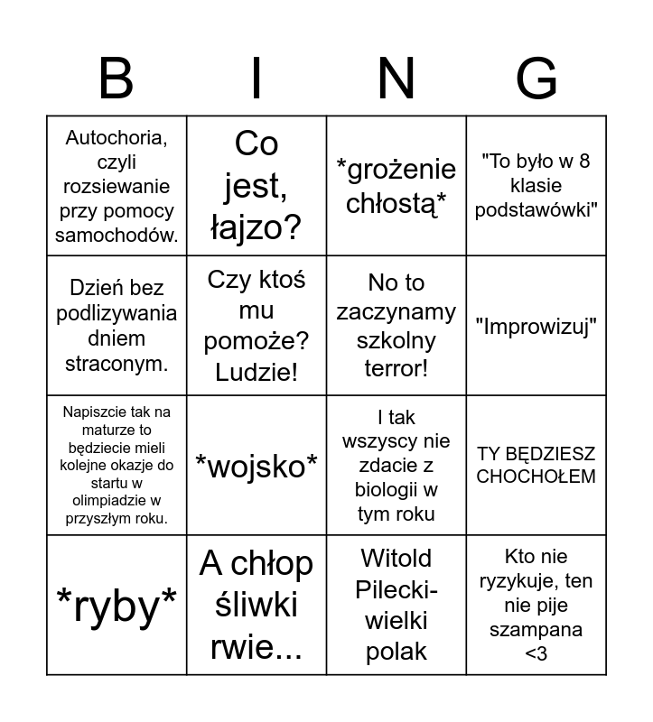 This bingo card has 16 words: A chłop śliwki rwie..., TY BĘDZIESZ CHOCHOŁEM, *grożenie chłostą*, Autochoria, czyli rozsiewanie przy pomocy samochodów., Napiszcie tak na maturze to będziecie mieli kolejne okazje do startu w olimpiadzie w przyszłym roku., Co jest, łajzo?, I tak wszyscy nie zdacie z biologii w tym roku, Witold Pilecki- wielki polak, Dzień bez podlizywania dniem straconym., Czy ktoś mu pomoże? Ludzie!, *ryby*, "To było w 8 klasie podstawówki", *wojsko*, "Improwizuj", No to zaczynamy szkolny terror! and Kto nie ryzykuje, ten nie pije szampana <3.
