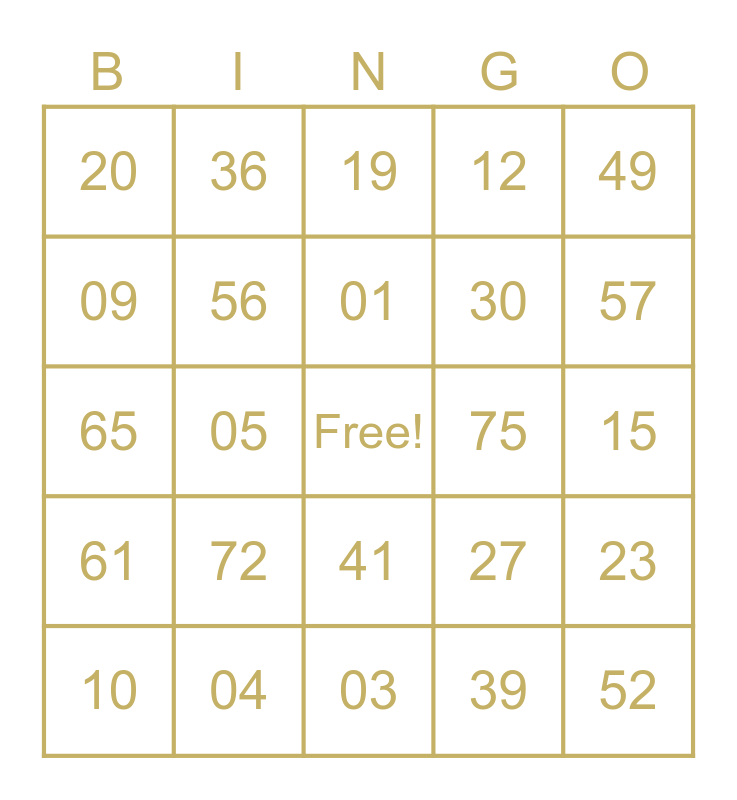 This bingo card has a free space and 29 words: 69, 04, 19, 33, 49, 20, 56, 01, 75, 23, 10, 05, 39, 52, 65, 47, 03, 27, 57, 61, 72, 43, 30, 15, 09, 36, 41, 12 and 60.