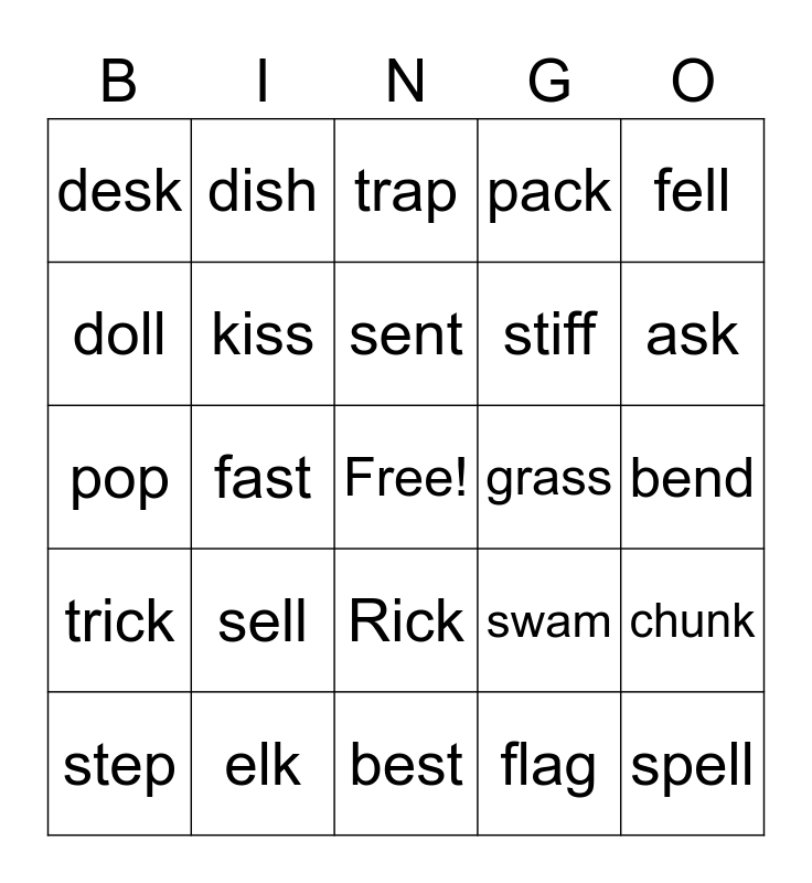This bingo card has a free space and 24 words: sell, elk, sent, step, fell, desk, doll, dish, grass, Rick, stiff, pop, swam, chunk, kiss, flag, bend, trap, ask, fast, spell, trick, pack and best.