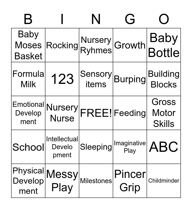 This bingo card has a free space and 24 words: Intellectual Develo pment, Messy Play, Sensory items, Physical Develop ment, Baby Bottle, Baby Moses Basket, Formula Milk, Rocking, Feeding, Sleeping, Burping, Emotional Develop ment, Imaginative Play, ABC, 123, Pincer Grip, Gross Motor Skills, Nursery Ryhmes, Building Blocks, Nursery Nurse, Childminder, School, Growth and Milestones.