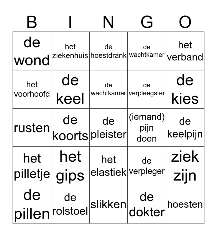 This bingo card has a free space and 24 words: het gips, de rolstoel, de wachtkamer, de pillen, het verband, de wond, het voorhoofd, het ziekenhuis, (iemand) pijn doen, het elastiek, de verpleegster, rusten, de verpleger, ziek zijn, de keel, de dokter, de keelpijn, de hoestdrank, de kies, de koorts, hoesten, het pilletje, de wachtkamer and slikken.