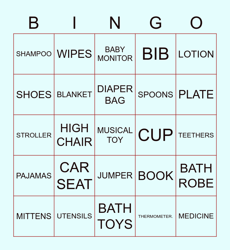 This bingo card has 25 words: CAR SEAT, BATH TOYS, DIAPER BAG, MITTENS, LOTION, SHAMPOO, SHOES, WIPES, CUP, JUMPER, SPOONS, STROLLER, BOOK, BATH ROBE, BLANKET, MEDICINE, TEETHERS, BABY MONITOR, PLATE, HIGH CHAIR, MUSICAL TOY, UTENSILS, PAJAMAS, BIB and THERMOMETER..