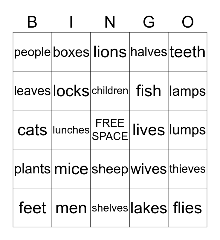 This bingo card has a free space and 24 words: mice, men, children, feet, teeth, people, leaves, boxes, lives, sheep, fish, cats, wives, thieves, locks, lakes, lumps, lions, lamps, lunches, flies, plants, halves and shelves.