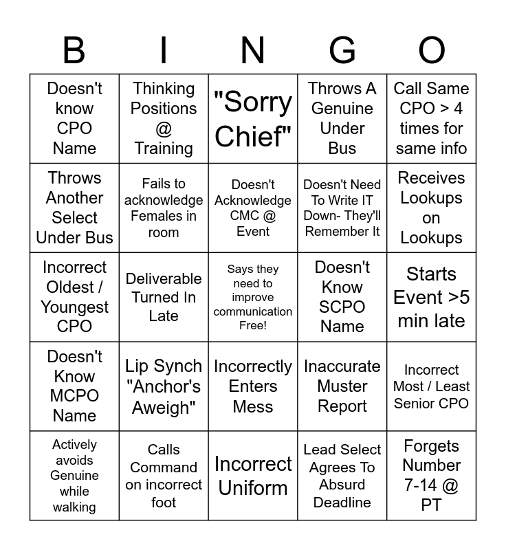 This bingo card has a free space and 24 words: Lip Synch "Anchor's Aweigh", Calls Command on incorrect foot, Doesn't Acknowledge CMC @ Event, Actively avoids Genuine while walking, Call Same CPO > 4 times for same info, Doesn't know CPO Name, Throws Another Select Under Bus, Thinking Positions @ Training, Doesn't Know SCPO Name, Incorrectly Enters Mess, Doesn't Need To Write IT Down- They'll Remember It, Incorrect Oldest / Youngest CPO, Inaccurate Muster Report, Incorrect Most / Least Senior CPO, Fails to acknowledge Females in room, Lead Select Agrees To Absurd Deadline, Starts Event >5 min late, "Sorry Chief", Receives Lookups on Lookups, Deliverable Turned In Late, Forgets Number 7-14 @ PT, Doesn't Know MCPO Name, Throws A Genuine Under Bus and Incorrect Uniform.