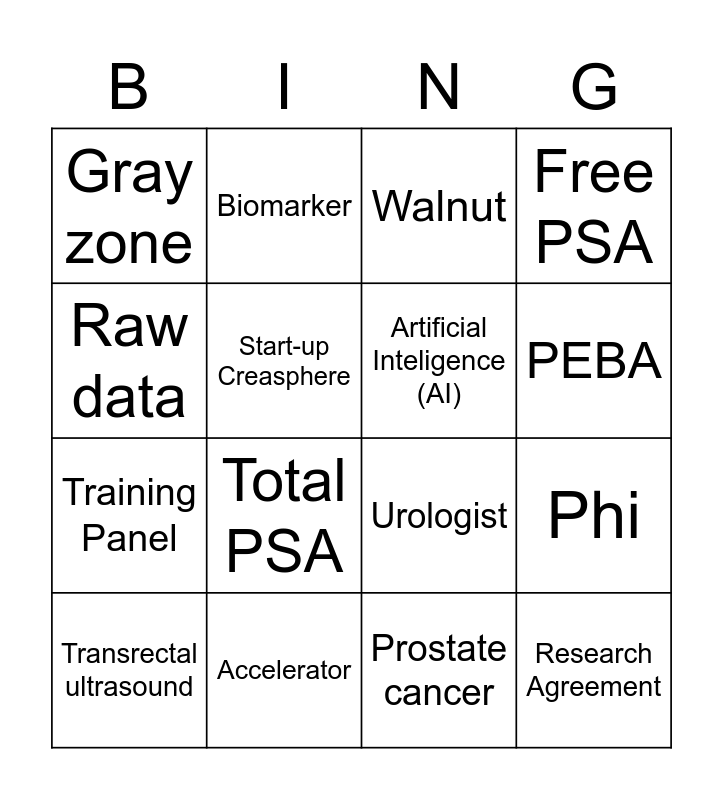 This bingo card has 17 words: Prostate cancer, Transrectal ultrasound, Walnut, Gray zone, Total PSA, Free PSA, Phi, Artificial Inteligence (AI), PEBA, Start-up Creasphere, Accelerator, Urologist, Raw data, Biomarker, Training Panel, Validation Panel and Research Agreement.