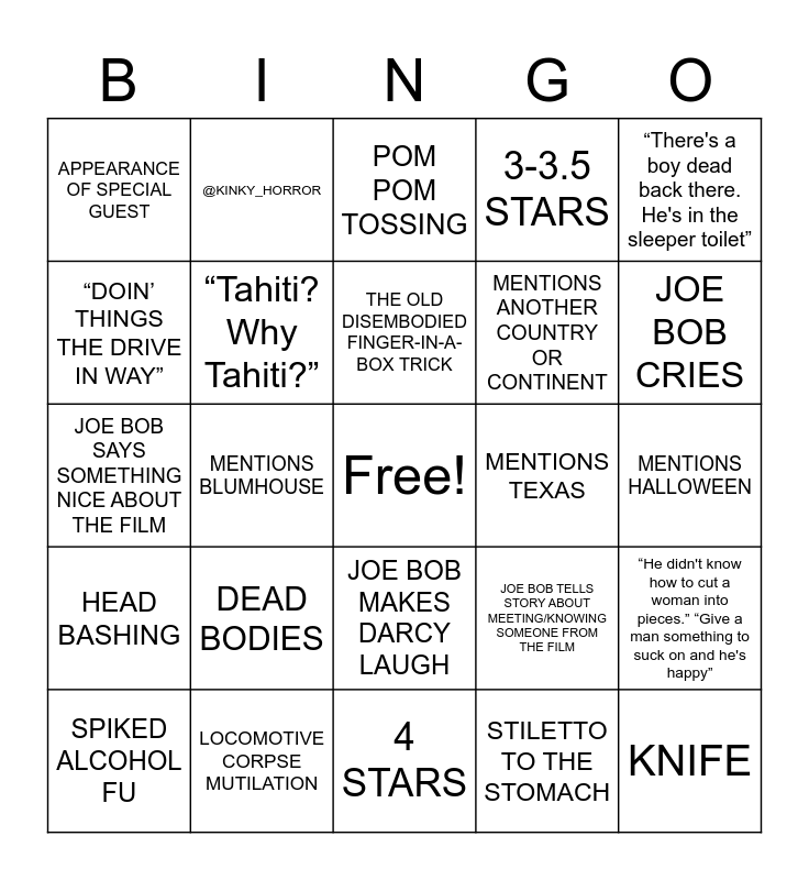 This bingo card has a free space and 24 words: DEAD BODIES, LOCOMOTIVE CORPSE MUTILATION, THE OLD DISEMBODIED FINGER-IN-A-BOX TRICK, SPIKED ALCOHOL FU, “There's a boy dead back there. He's in the sleeper toilet”, APPEARANCE OF SPECIAL GUEST, “DOIN’ THINGS THE DRIVE IN WAY”, @KINKY_HORROR, MENTIONS TEXAS, JOE BOB MAKES DARCY LAUGH, MENTIONS ANOTHER COUNTRY OR CONTINENT, JOE BOB SAYS SOMETHING NICE ABOUT THE FILM, JOE BOB TELLS STORY ABOUT MEETING/KNOWING SOMEONE FROM THE FILM, “He didn't know how to cut a woman into pieces.” “Give a man something to suck on and he's happy”, “Tahiti? Why Tahiti?”, STILETTO TO THE STOMACH, MENTIONS HALLOWEEN, POM POM TOSSING, JOE BOB CRIES, MENTIONS BLUMHOUSE, KNIFE, HEAD BASHING, 3-3.5 STARS and 4 STARS.