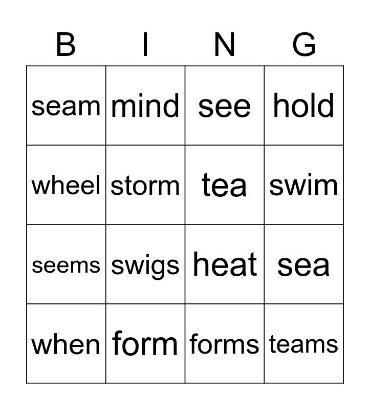 This bingo card has 16 words: form, sea, see, seam, seems, mind, heat, forms, wheel, storm, when, hold, swigs, swim, tea and teams.