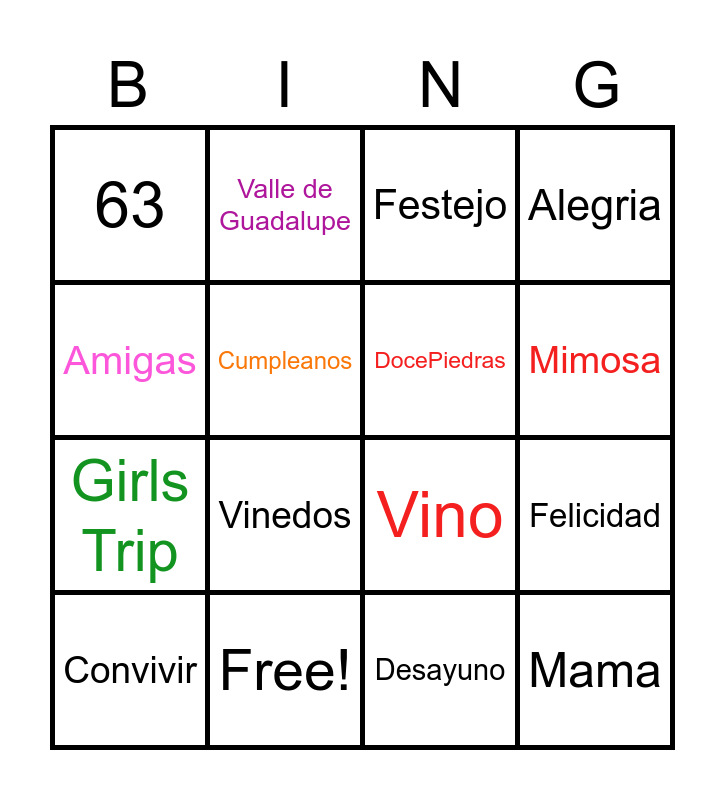 This bingo card has 24 words: Brunch, Party van, Mimosa, Facial, Amigas, 63, Cumpleanos, Valle de Guadalupe, Free!, Celebracion, Girls Trip, Vino, Pastel, Alicia, DocePiedras, SALUD, Desayuno, Festejo, Vinedos, Felicidad, Convivir, Mama, Alegria and Diversion.