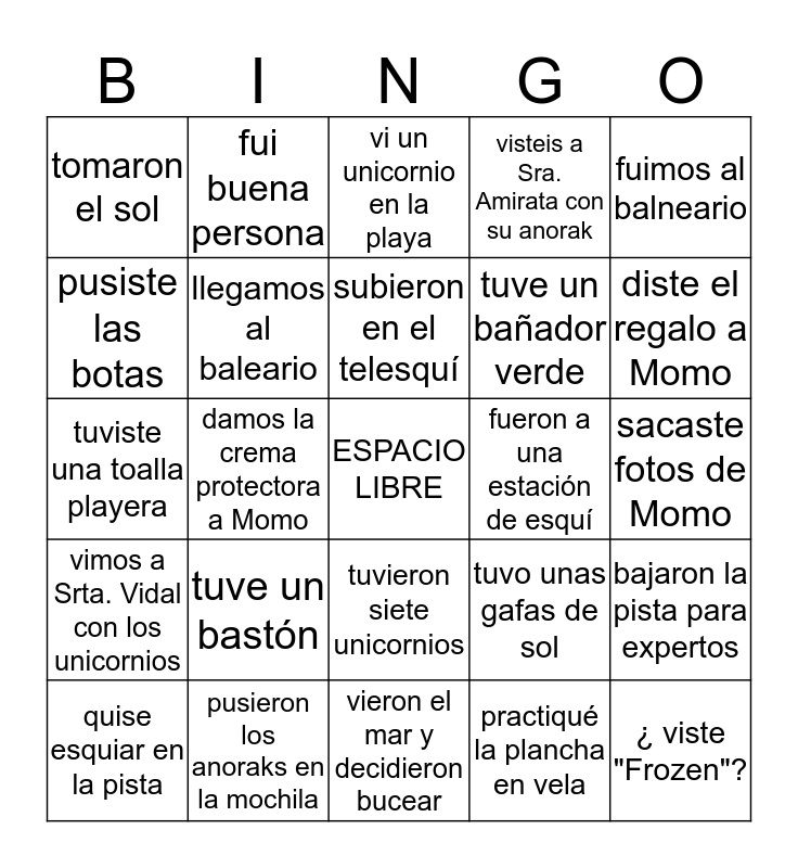 This bingo card has a free space and 24 words: tuve un bastón, pusieron los anoraks en la mochila, subieron en el telesquí, quise esquiar en la pista, fuimos al balneario, tomaron el sol, pusiste las botas, fui buena persona, fueron a una estación de esquí, tuvieron siete unicornios, tuve un bañador verde, tuviste una toalla playera, tuvo unas gafas de sol, bajaron la pista para expertos, llegamos al baleario, practiqué la plancha en vela, sacaste fotos de Momo, vi un unicornio en la playa, diste el regalo a Momo, damos la crema protectora a Momo, ¿ viste "Frozen"?, vimos a Srta. Vidal con los unicornios, visteis a Sra. Amirata con su anorak and vieron el mar y decidieron bucear.