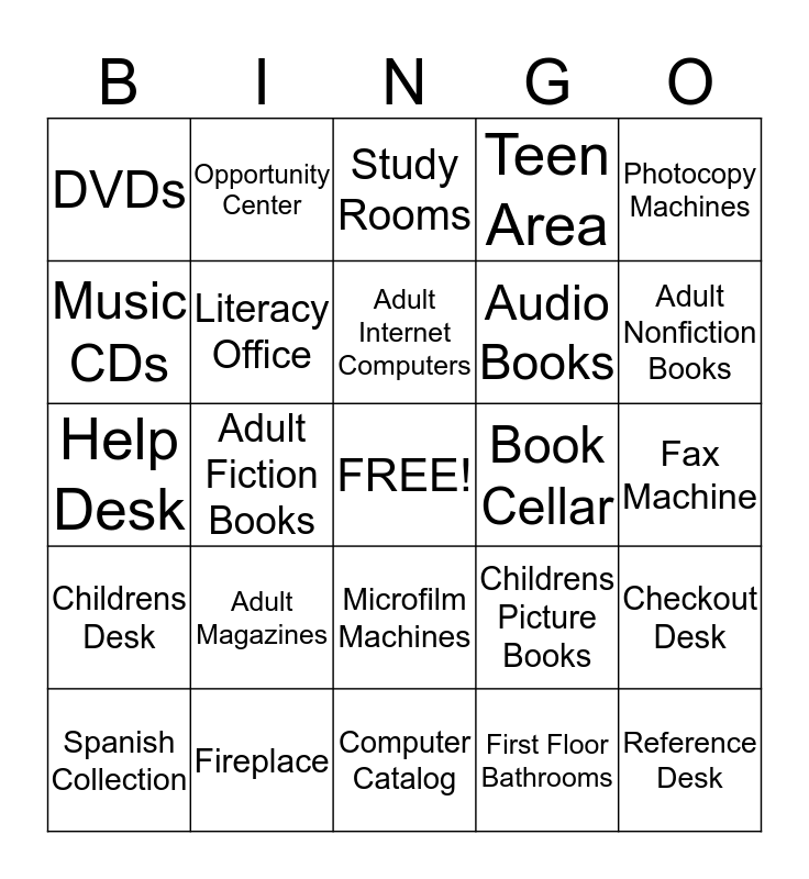 This bingo card has a free space and 24 words: Adult Magazines, Fireplace, Adult Internet Computers, Spanish Collection, Photocopy Machines, DVDs, Music CDs, Opportunity Center, Book Cellar, Microfilm Machines, Audio Books, Help Desk, Childrens Picture Books, Checkout Desk, Literacy Office, First Floor Bathrooms, Fax Machine, Study Rooms, Adult Nonfiction Books, Adult Fiction Books, Reference Desk, Childrens Desk, Teen Area and Computer Catalog.