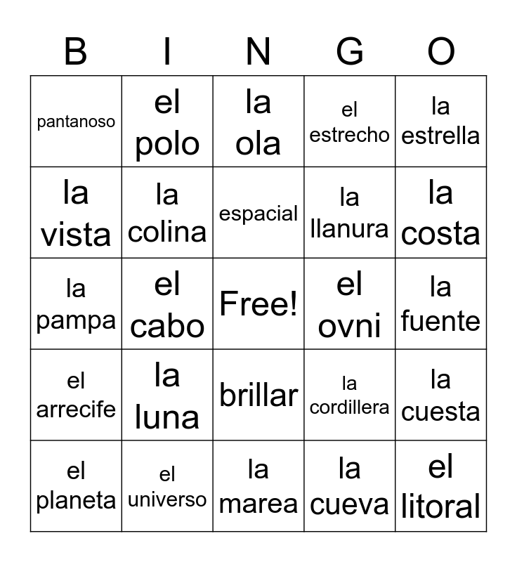This bingo card has a free space and 24 words: la luna, el universo, espacial, el planeta, la estrella, pantanoso, la vista, el polo, el ovni, brillar, la llanura, la pampa, la cordillera, la cuesta, la colina, la cueva, la fuente, la ola, la costa, el cabo, el litoral, el arrecife, el estrecho and la marea.