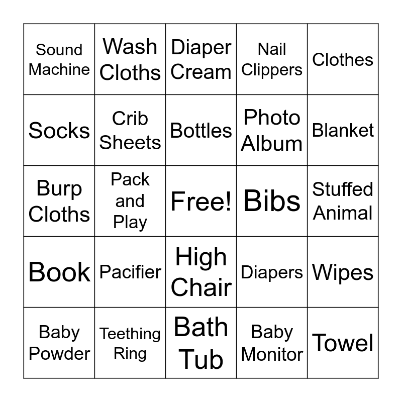 This bingo card has a free space and 24 words: Pacifier, Teething Ring, Bottles, Baby Powder, Clothes, Sound Machine, Socks, Wash Cloths, Bibs, High Chair, Photo Album, Burp Cloths, Diapers, Wipes, Crib Sheets, Baby Monitor, Stuffed Animal, Diaper Cream, Blanket, Pack and Play, Towel, Book, Nail Clippers and Bath Tub.
