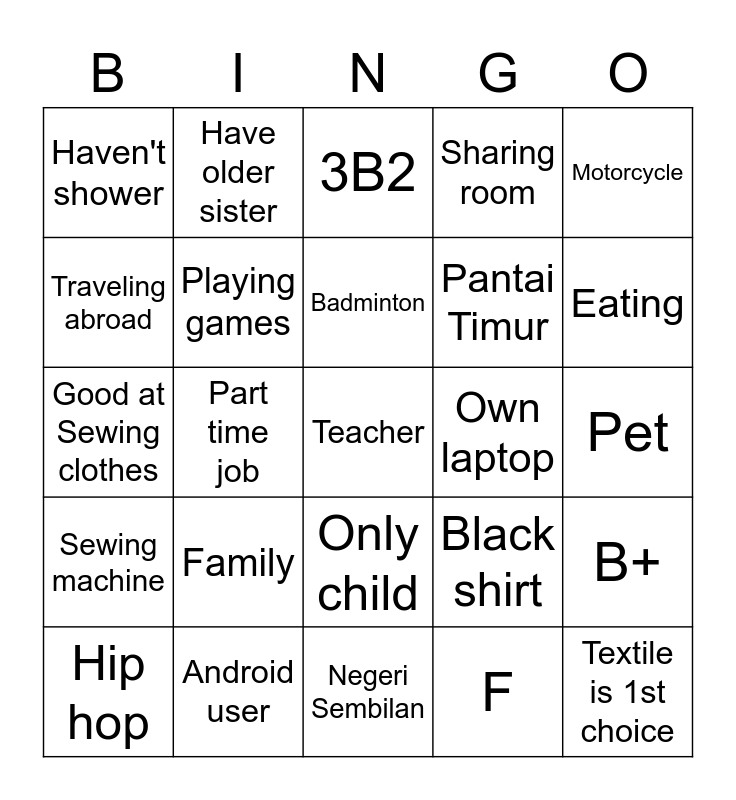This bingo card has 25 words: Family, Negeri Sembilan, Badminton, Hip hop, Motorcycle, Haven't shower, Traveling abroad, Have older sister, Own laptop, Only child, Pantai Timur, Good at Sewing clothes, Black shirt, B+, Playing games, Textile is 1st choice, Pet, 3B2, Eating, Part time job, Teacher, Android user, Sewing machine, Sharing room and F.
