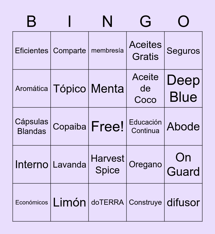 This bingo card has a free space and 24 words: Lavanda, Limón, Menta, Económicos, Seguros, Eficientes, Aromática, Comparte, Educación Continua, Harvest Spice, Aceite de Coco, Cápsulas Blandas, Oregano, On Guard, Tópico, Construye, Abode, membresía, Deep Blue, Copaiba, difusor, Interno, Aceites Gratis and doTERRA.