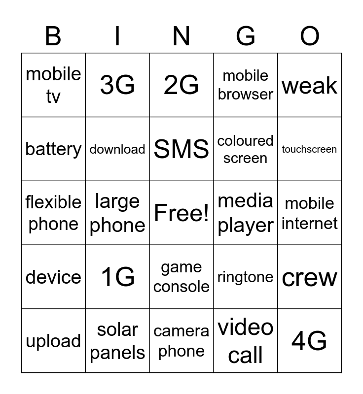 This bingo card has a free space and 24 words: 1G, solar panels, SMS, upload, weak, mobile tv, battery, 3G, media player, game console, coloured screen, flexible phone, ringtone, crew, download, video call, mobile internet, 2G, touchscreen, large phone, 4G, device, mobile browser and camera phone.
