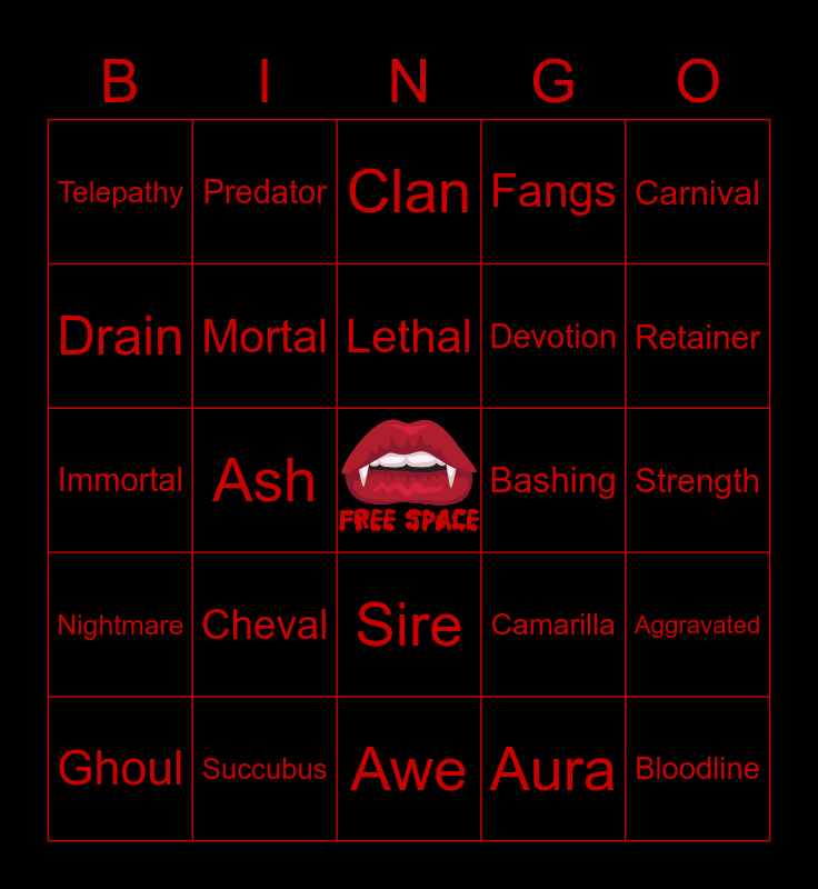 This bingo card has a free space and 50 words: Vampire, Bloodline, Invictus, Awe, Cheval, Diablerie, Predator, Dracula, Drain, Crypt, Mortal, Fangs, Aggravated, Camarilla, Gangrel, Crone, Lethal, Bashing, Duel, Carnival, Ash, Aura, Telepathy, Devotion, Discipline, Herd, Retainer, Haven, Clan, Sire, Shadow, Savage, Beast, Haunt, Succubus, Eclipse, New Moon, Dexterity, Stamina, Strength, Acolyte, Composure, Blood, Sanctified, Ghoul, Immortal, Undead, Dominate, Nightmare and Stake.