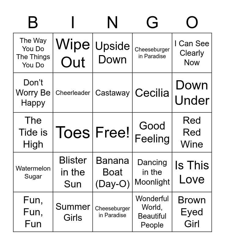 This bingo card has a free space and 65 words: Could You Be Loved, Break My Stride, Escape (The Pina Colada Song), Is This Love, Margaritaville, It’s 5 o’clock Somewhere, Wipe Out, Cake By the Ocean, Castaway, Hawaii Five-O, Banana Boat (Day-O), In the Summertime, Red Red Wine, I Can See Clearly Now, Three Little Birds, Don’t Worry Be Happy, Toes, The Way You Do The Things You Do, Jump in the Line, Cecilia, Blister in the Sun, Watermelon Sugar, Cheeseburger in Paradise, Two Pina Coladas, Some Beach, No Shoes, No Shirt, No Problem, Santeria, Good Vibrations, Brown Eyed Girl, Volcano, Fun, Fun, Fun, Sweat (A La La La La La Long), Beers and Sunshine, Savage Love, Dancing in the Moonlight, Summer Girls, Summertime, The Tide is High, Wonderful World, Beautiful People, Sweet Sensation, Cheerleader, Beautiful Girls, Good Feeling, Shotgun, Send Me On My Way, The Sound of Sunshine, Down Under, Summer, Knocking at Your Door, Lift Me Up, Say Hey (I Love You), Jamming, Riptide, Cheeseburger in Paradise, Hotel California, Angel, Bad Boys, Upside Down, Here Comes the Sun, Diamonds on the Soles of her Shoes, You Make Me Happy, Africa, I Like It Like That, Cruel Summer and Sounds of Summer.
