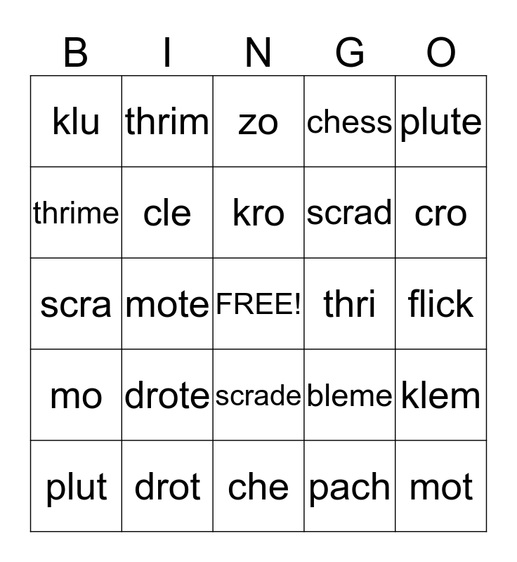 This bingo card has a free space and 24 words: drote, drot, kro, plut, plute, klu, thrime, thrim, thri, scrade, scrad, scra, bleme, klem, cle, pach, flick, zo, cro, mote, mot, mo, chess and che.