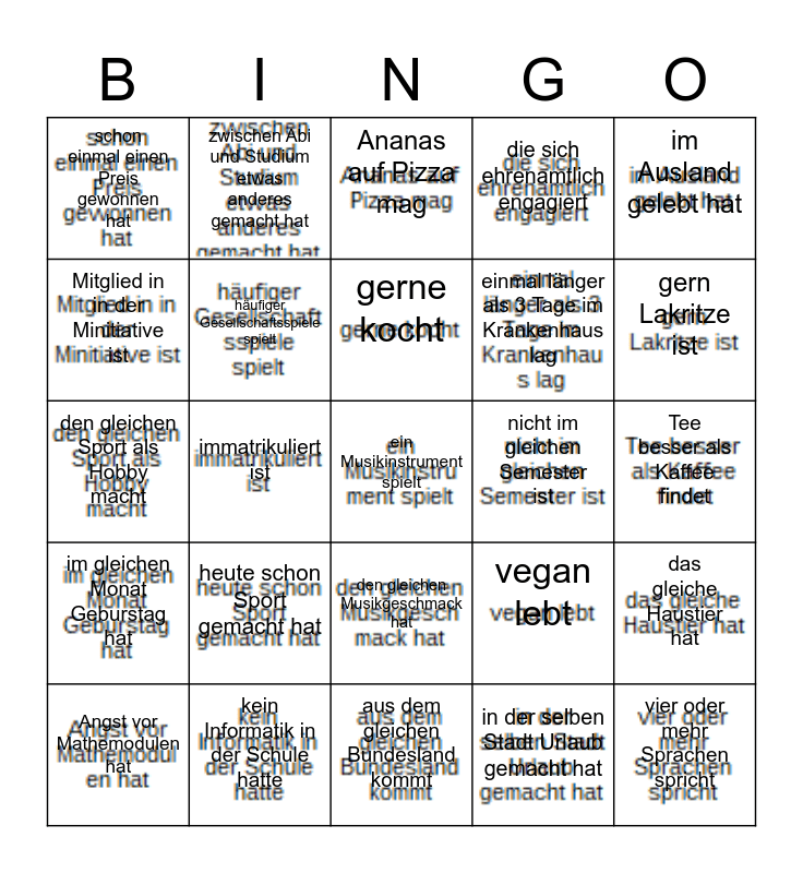 This bingo card has 25 images and 25 words: heute schon Sport gemacht hat, aus dem gleichen Bundesland kommt, gerne kocht, Angst vor Mathemodulen hat, im Ausland gelebt hat, schon einmal einen Preis gewonnen hat, Mitglied in in der Minitiative ist, zwischen Abi und Studium etwas anderes gemacht hat, nicht im gleichen Semester ist, den gleichen Musikgeschmack hat, einmal länger als 3 Tage im Krankenhaus lag, den gleichen Sport als Hobby macht, vegan lebt, das gleiche Haustier hat, häufiger Gesellschaftsspiele spielt, vier oder mehr Sprachen spricht, Tee besser als Kaffee findet, Ananas auf Pizza mag, gern Lakritze ist, immatrikuliert ist, ein Musikinstrument spielt, kein Informatik in der Schule hatte, im gleichen Monat Geburstag hat, die sich ehrenamtlich engagiert and in der selben Stadt Urlaub gemacht hat.