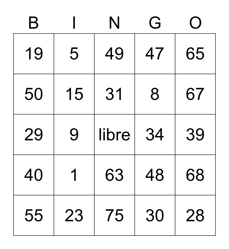 This bingo card has a free space and 24 words: 1, 23, 31, 55, 65, 19, 50, 5, 34, 63, 8, 29, 48, 68, 15, 30, 39, 49, 67, 9, 28, 40, 47 and 75.