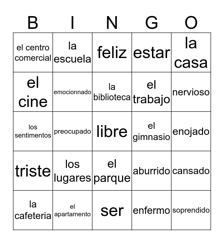 This bingo card has a free space and 24 words: los lugares, el apartamento, la biblioteca, la cafeteria, la casa, el centro comercial, el cine, la escuela, el gimnasio, el parque, el trabajo, los sentimentos, aburrido, cansado, emocionnado, enfermo, enojado, feliz, nervioso, preocupado, soprendido, triste, estar and ser.